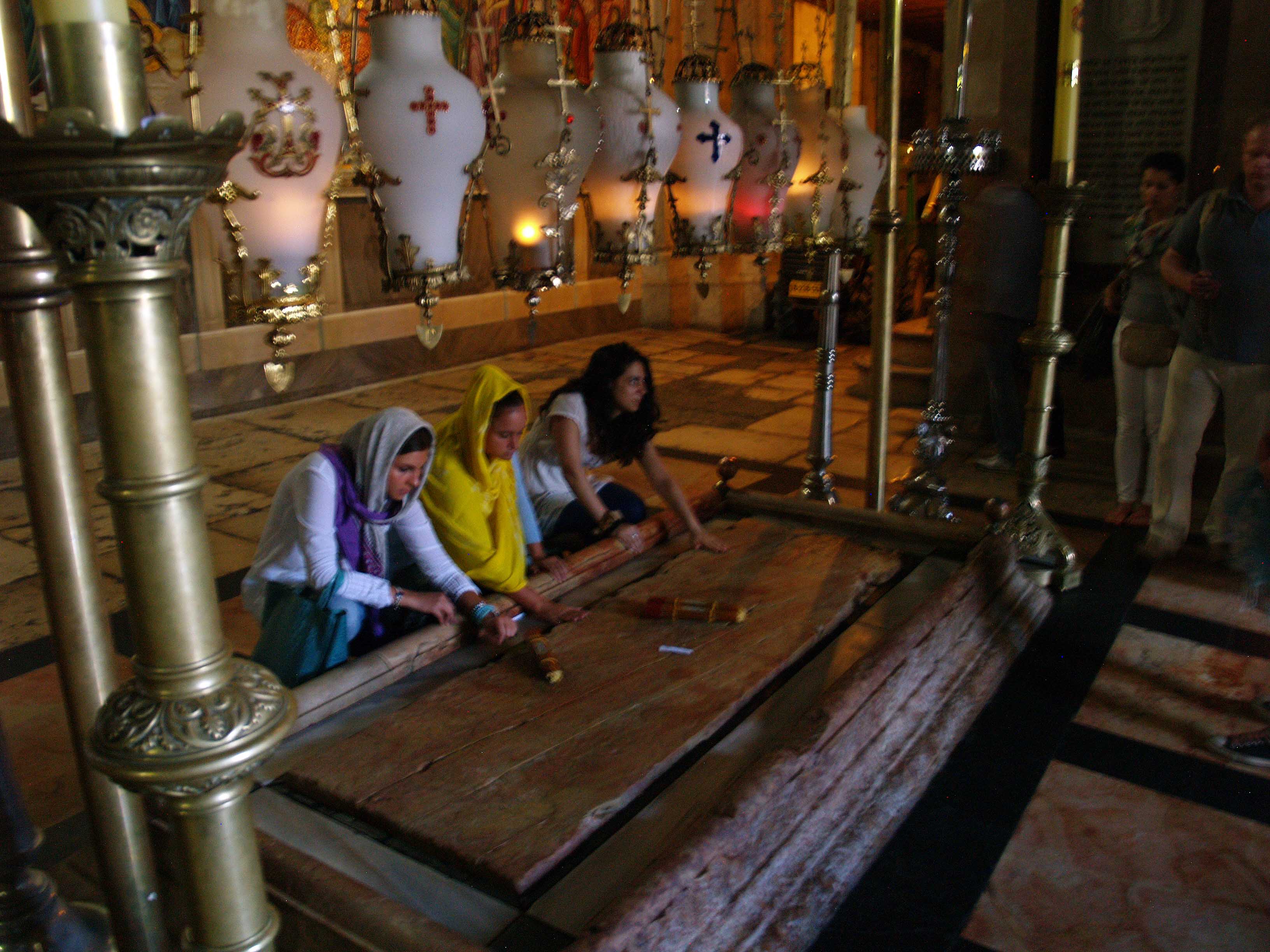 En otro lugar del templo hay una losa junto a la que multitud de personas se arrodillan apoyando en ella manos y cabezas, orando con fervor. Pasan sobre la superficie pañuelos, objetos diversos, al parecer en un intento de atrapar la fuerza telúrica, el poder santificante de esa piedra en la que, dicen, se sitúa la unción y el sudario de Jesús. La guía dice que la losa data de 1810.