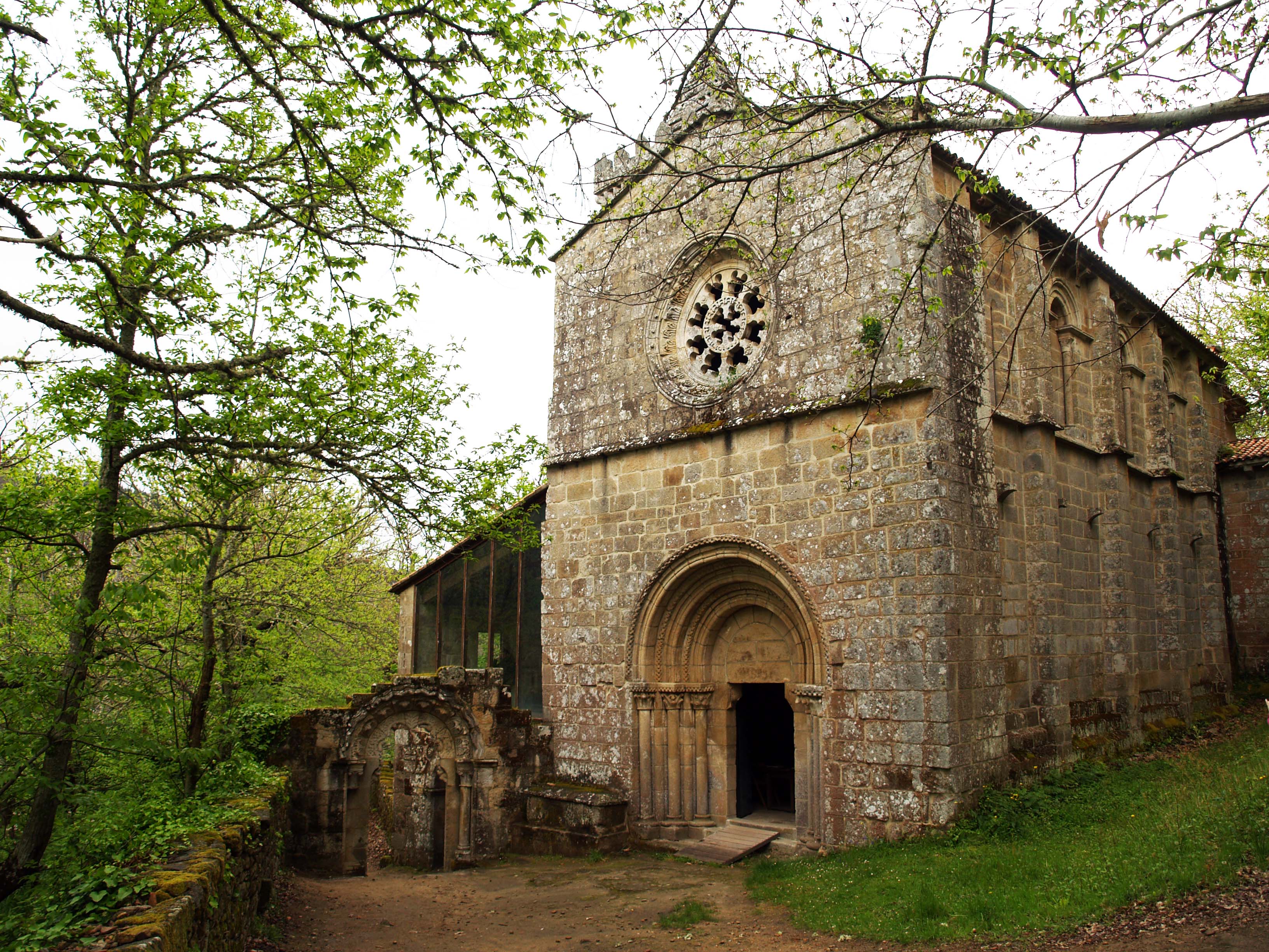 Más allá nos reciben los fantasmas de los monjes en el Monasterio de Santa Cristina de Ribas de Sil acostados sobre el musgo más verde que jamás he visto, bajo las ramas de nogales y castaños, bajo la atenta mirada de un San Benito