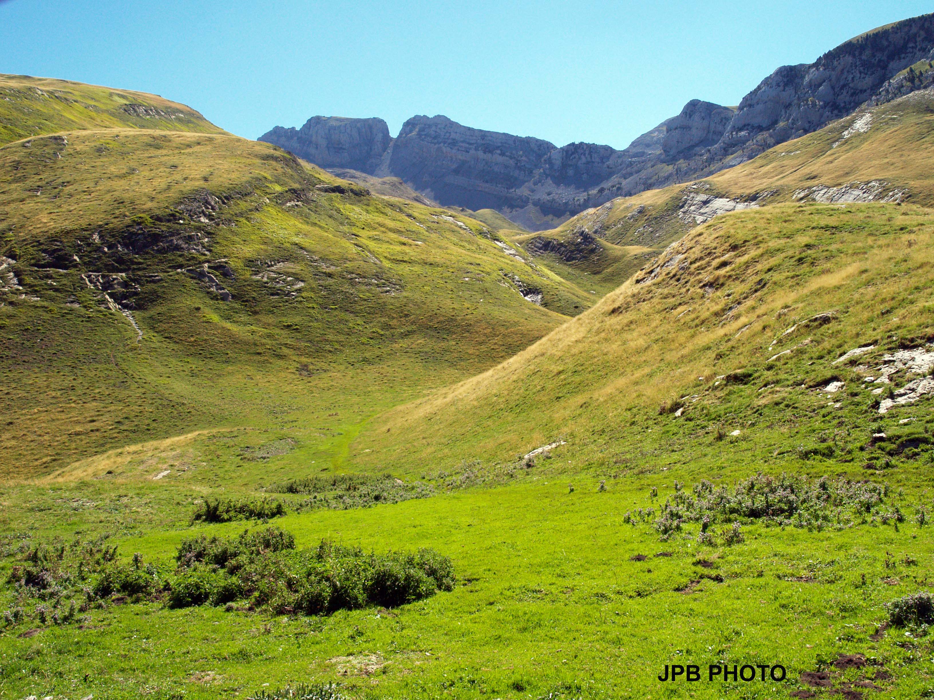Al salir del bosque me recibe una extensa pradera que sube y baja en enérgicas pendientes, altas montañas tapizadas de hierba, iluminadas por el ya fuerte sol de la mañana que aparece entre las moles rocosas del Ginebral de Gamueta y el Mallo Acherito. Todos los matices del verde extendidos entre líneas curvas, interrumpidos por los trazos grises y caóticos de los barrancos, ahora con apenas algo de agua, que se desploman desde las alturas. No hay árboles, estoy cerca de los 2.000 m, sólo hierba salpicada de pequeñas flores y herida por trazos terrosos.