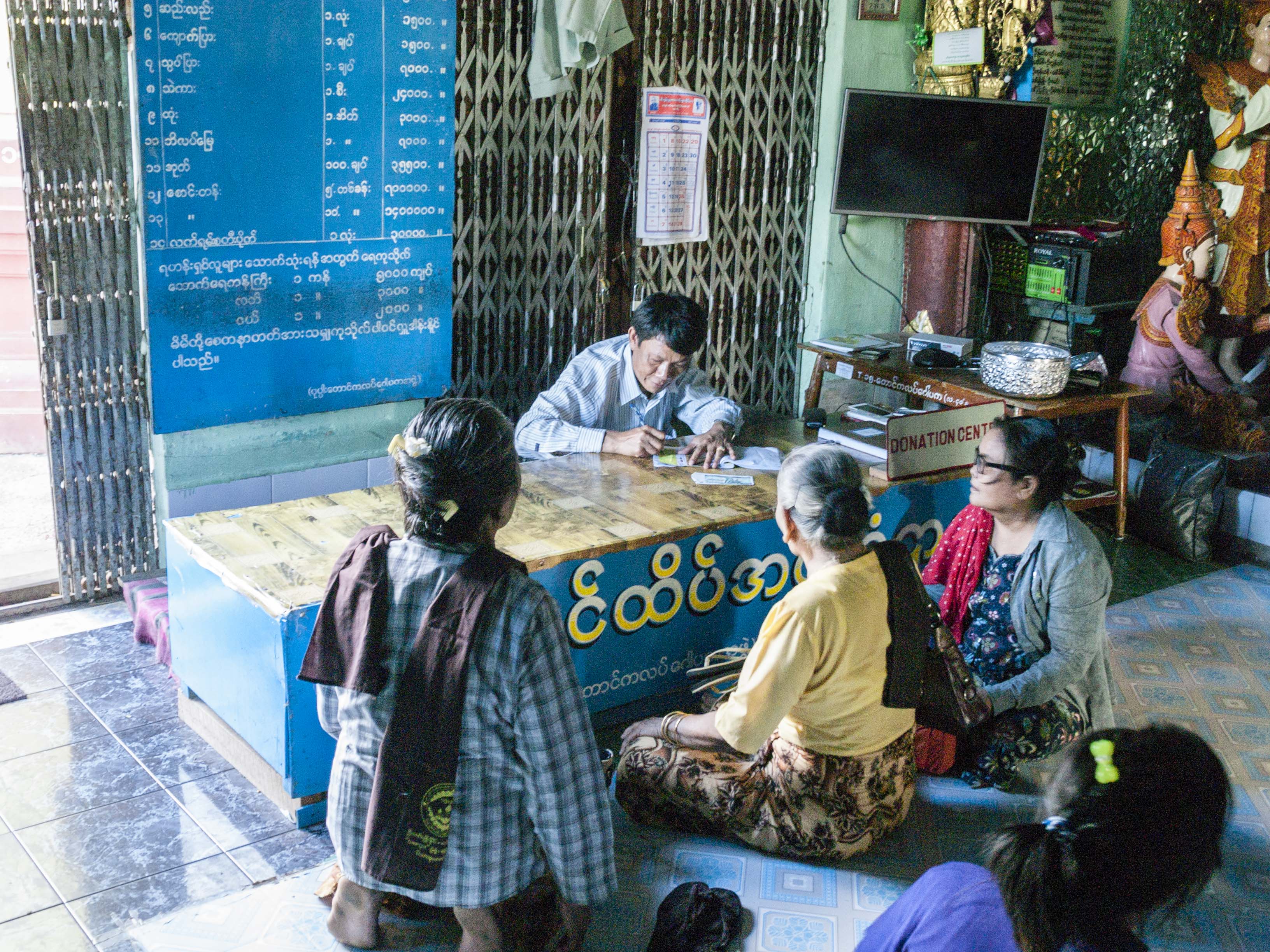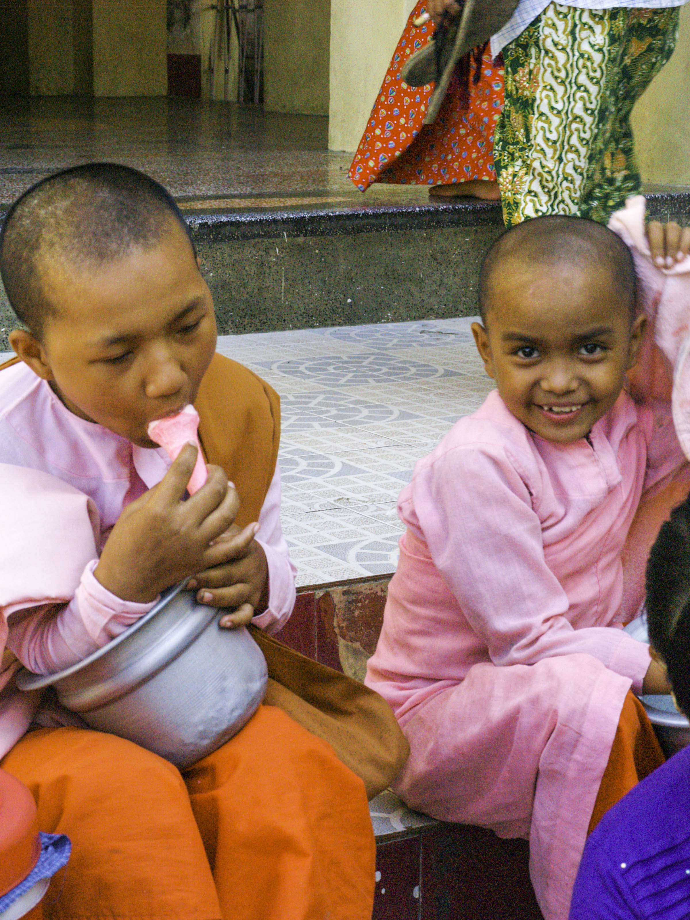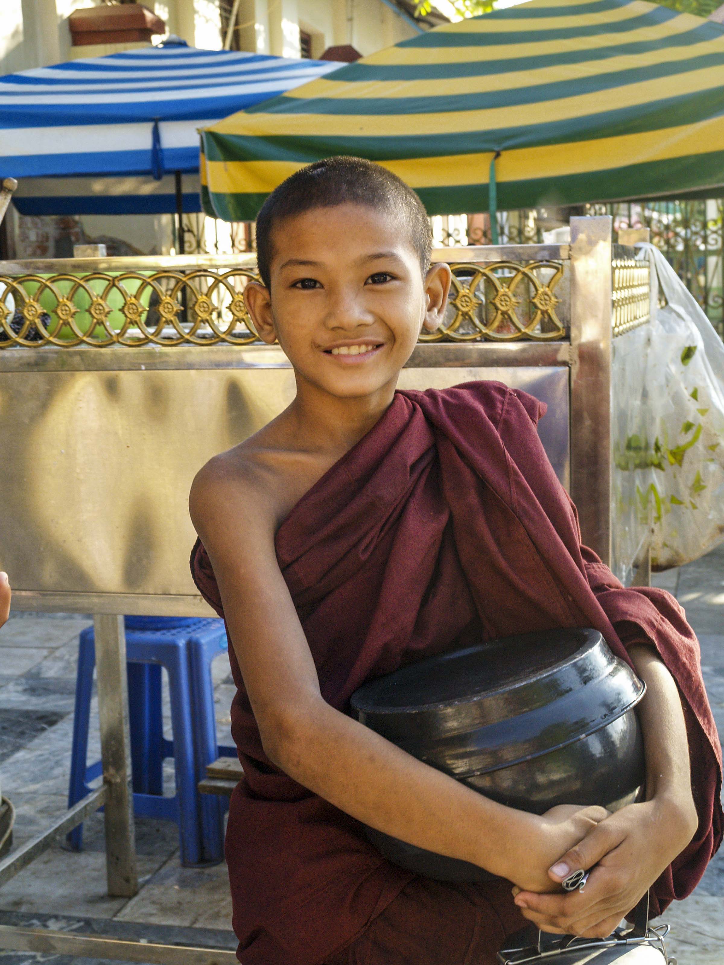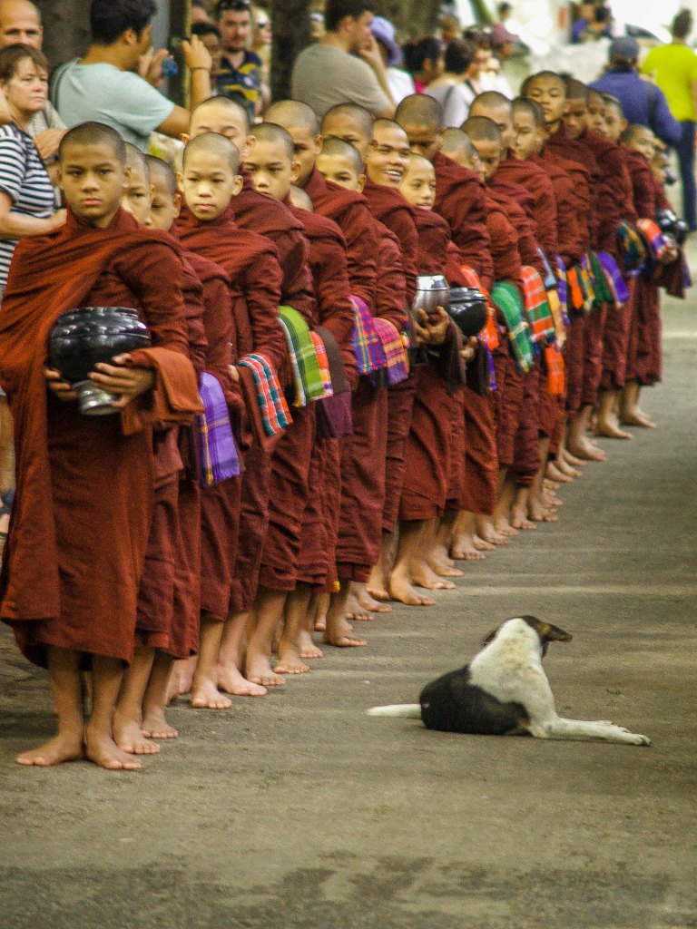 En el monasterio Maha Ganayon de Amarapura se produce un llamativo fenómeno diario. A mitad de mañana, monjes y novicios, cada uno con su cuenco en las manos, entran ordenadamente en el comedor para tomar su comida, arroz hervido y frutas. Generalmente la comida ha sido donada por personas que reciben, como pago, las oraciones de la comunidad.