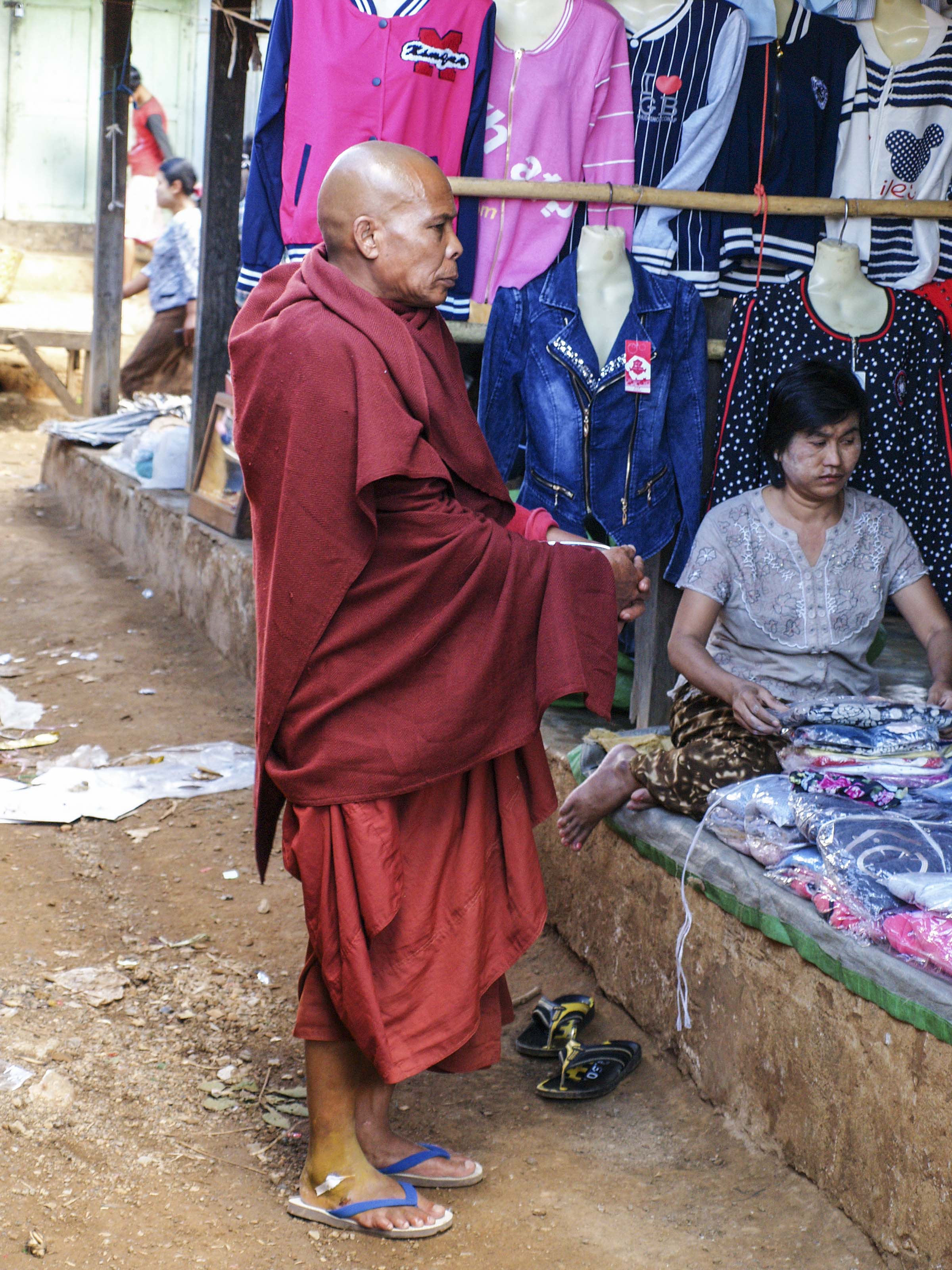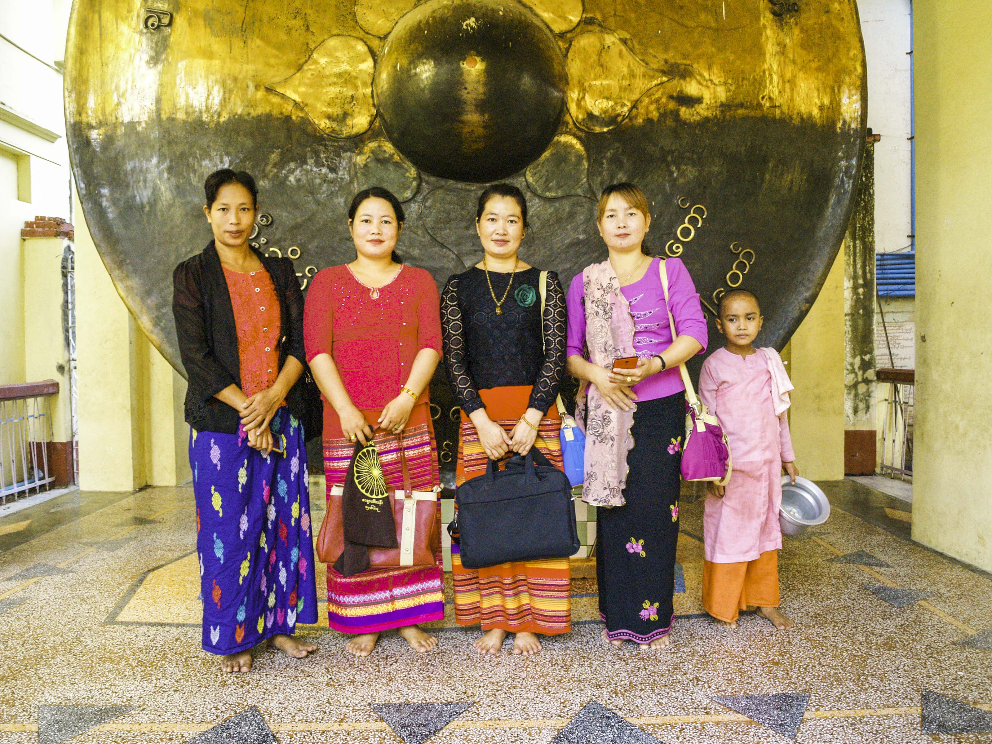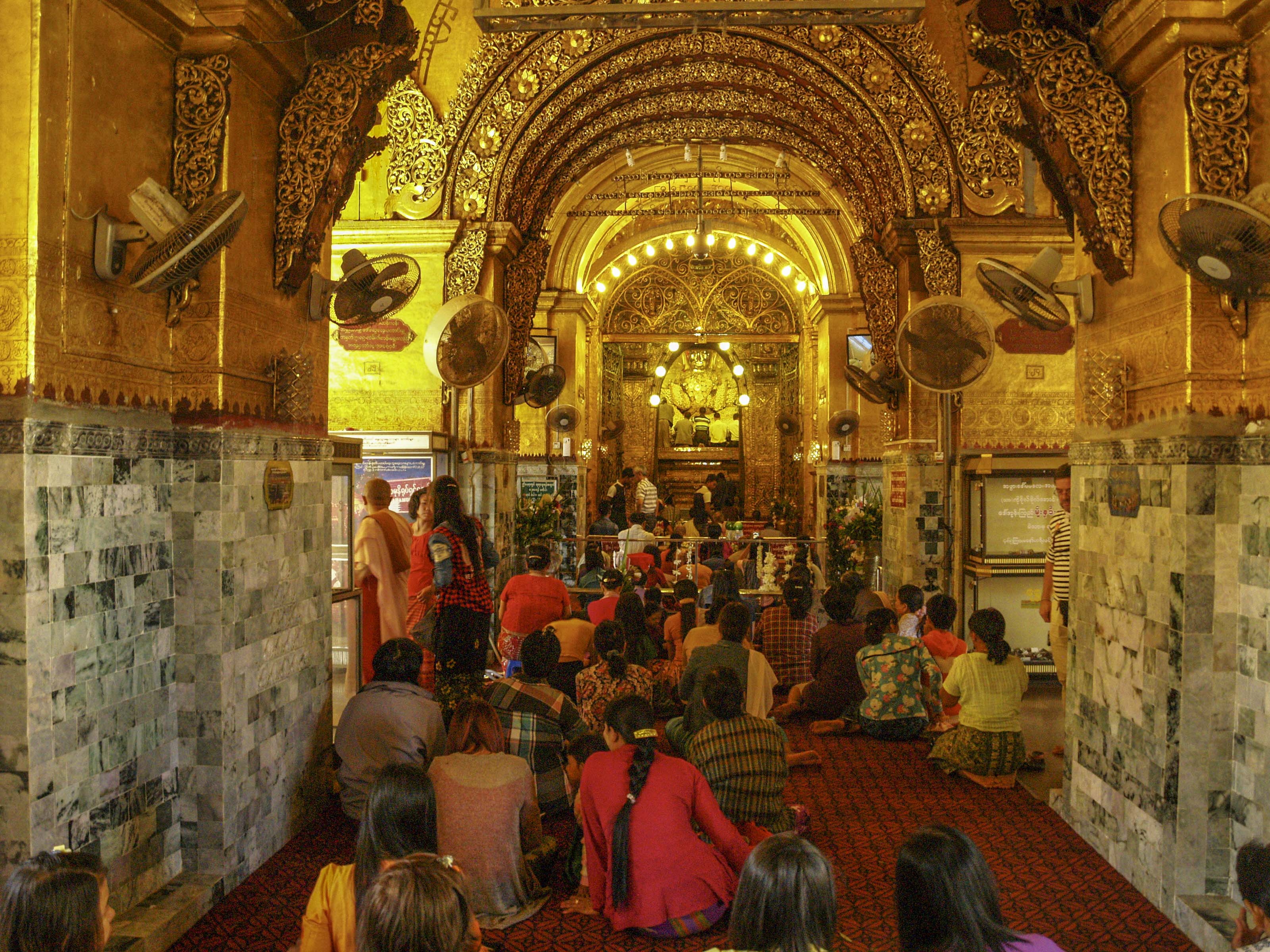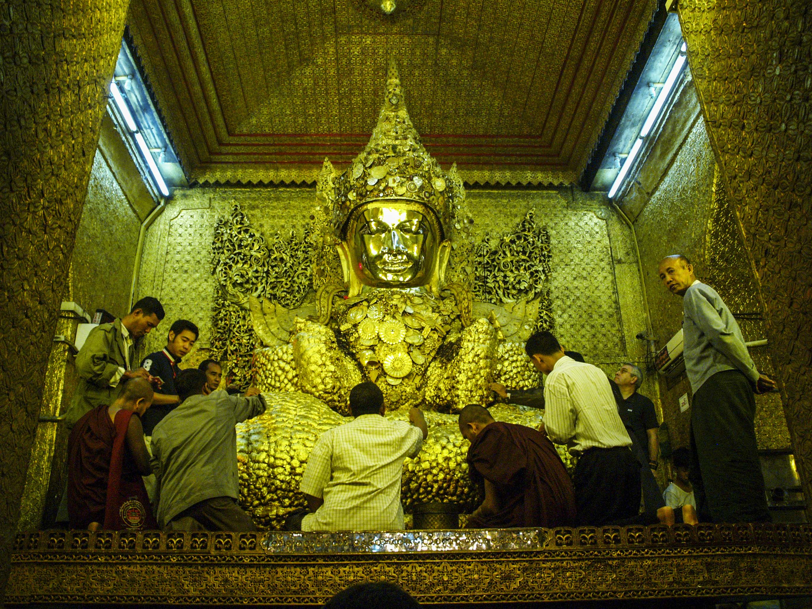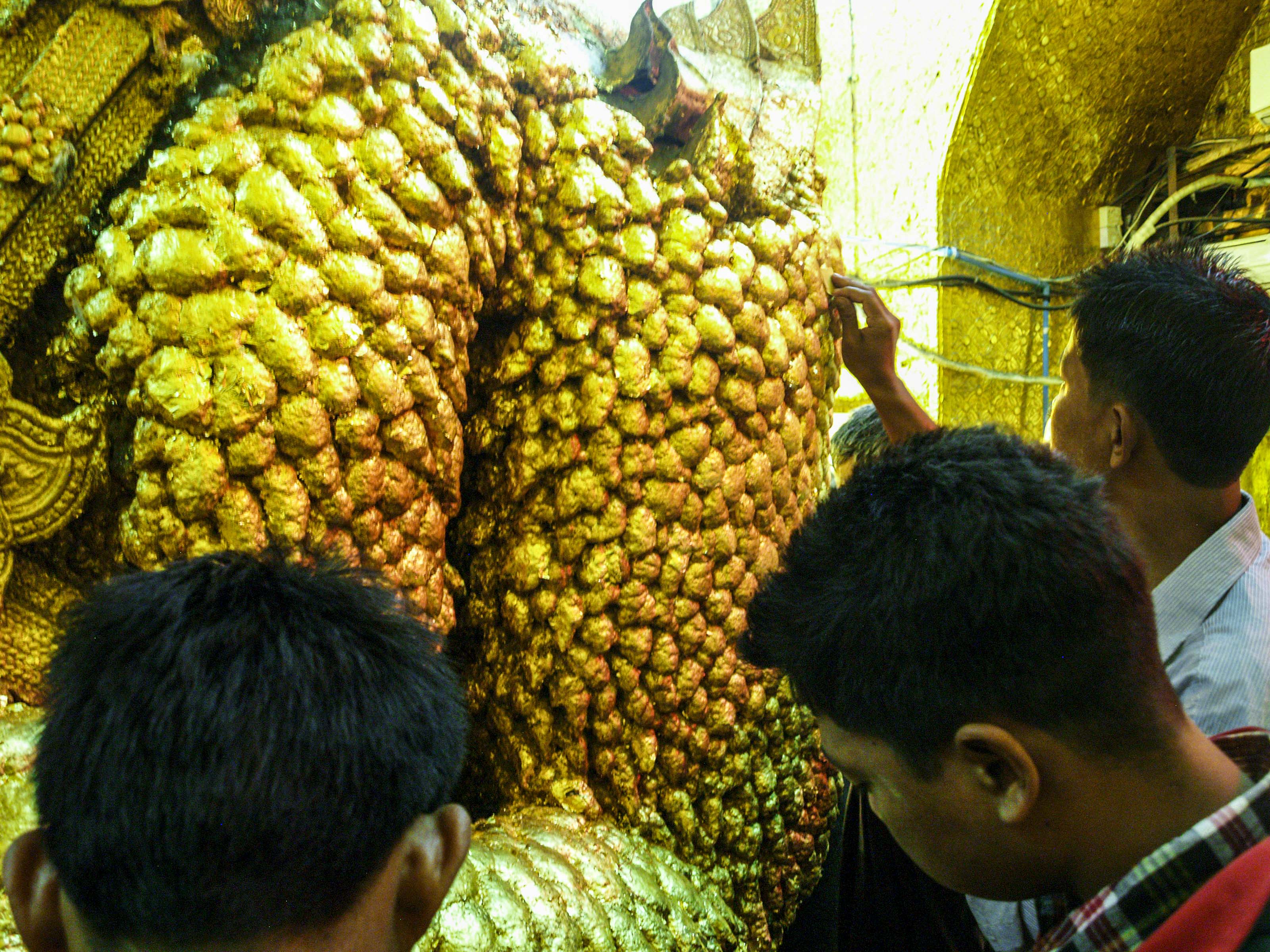 La pagoda Mahamuni, en la ciudad de Mandalay,  alberga al Buda más venerado de Myanmar. Tiene 4 metros de altura y más de 2000 años de antigüedad. Compramos unas pequeñas láminas de pan de oro y accedemos, sólo los hombres, a la figura para colocar las laminillas doradas en su superficie. Salvo la cabeza, que pulen diariamente, el resto está deformado, inflado, por la gran cantidad de esas finas hojitas de oro que fieles y curiosos colocamos; parece ser que tras siglos de esa costumbre,  la capa de oro tiene unos 15 cm de espesor. Dice la leyenda que es la única copia de la figura de Buda que se realizó mientras él vivía. Las mujeres deben de contentarse con la oración en la sala presidida por Mahamuni.