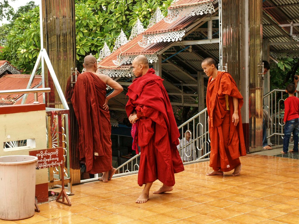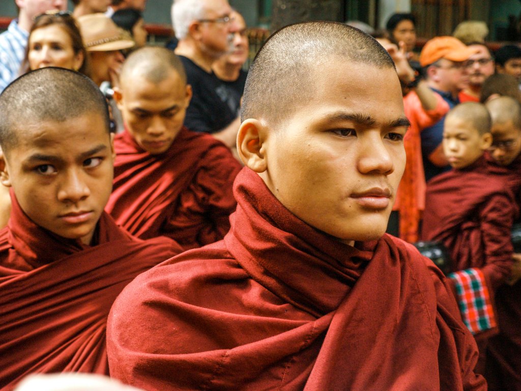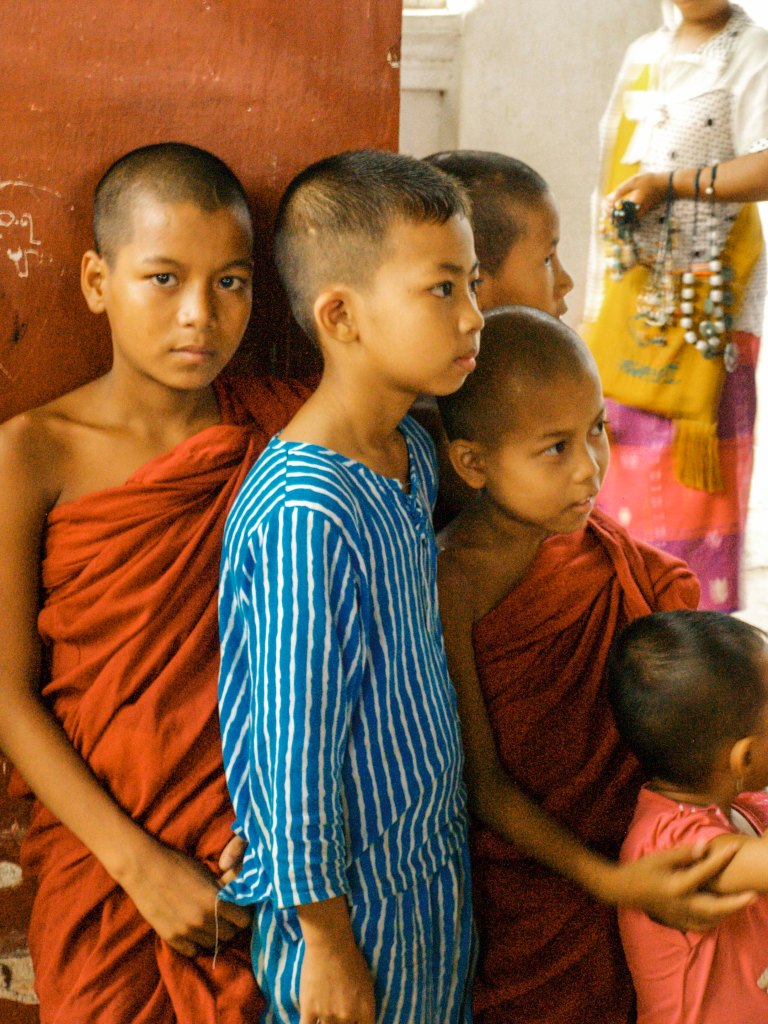 El estudio del budismo theravada se realiza en los monasterios, por eso es casi universal entre los budistas, que los muchachos pasen unos años, como una especie de una educación primaria, en un monasterio. Los niños viven allí hasta que deciden seguir su vida como monjes o, suele ser lo más frecuente, abandonar el monasterio con el bagaje de su preparación espiritual. Es frecuente encontrar a muchos niños de corta edad vestidos de monjes, deambulando por las calles con un cuenco en las manos, jugando en los patios de los monasterios, en filas ordenadas para recoger la comida o caminando por cualquier carretera o camino. En el cuenco reciben la comida y donativos que los birmanos entregan como parte de su compromiso espiritual. Los monjes son importantes y respetados en la sociedad birmana; a ellos se recurre como maestros espirituales, para impartir sermones en días señalados o buscar consejos en los conflictos sociales o personales. Hay algún monje que vive aislado, en el campo, como ermitaños.