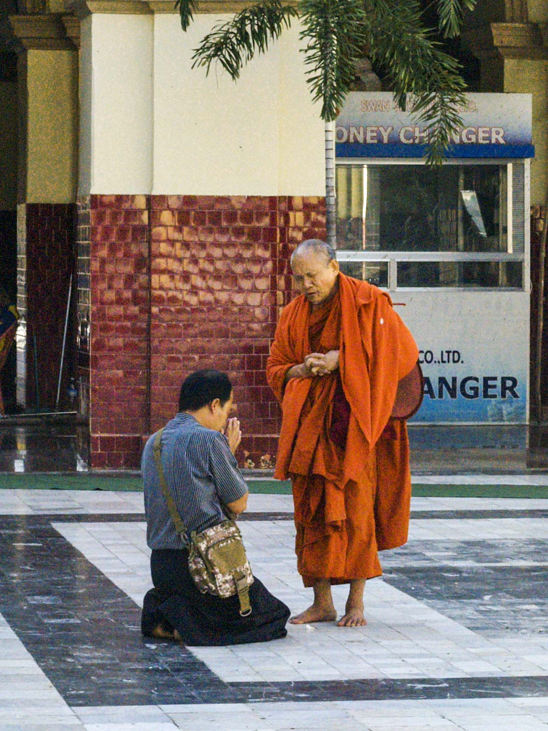 En el patio un hombre se arrodilla ante un monje. En su estética la imagen me recuerda, salvando diferencias esenciales, a Juan Pablo II amonestando a Ernesto Cardenal en su visita a Nicaragua. El templo exhibe tonos dorados por todos los rincones, hay muchas personas por los pasillos, por las salas. Niños vestidos de monjes, monjes adultos con cuencos en las manos, monjas mezcladas con el resto de personas.