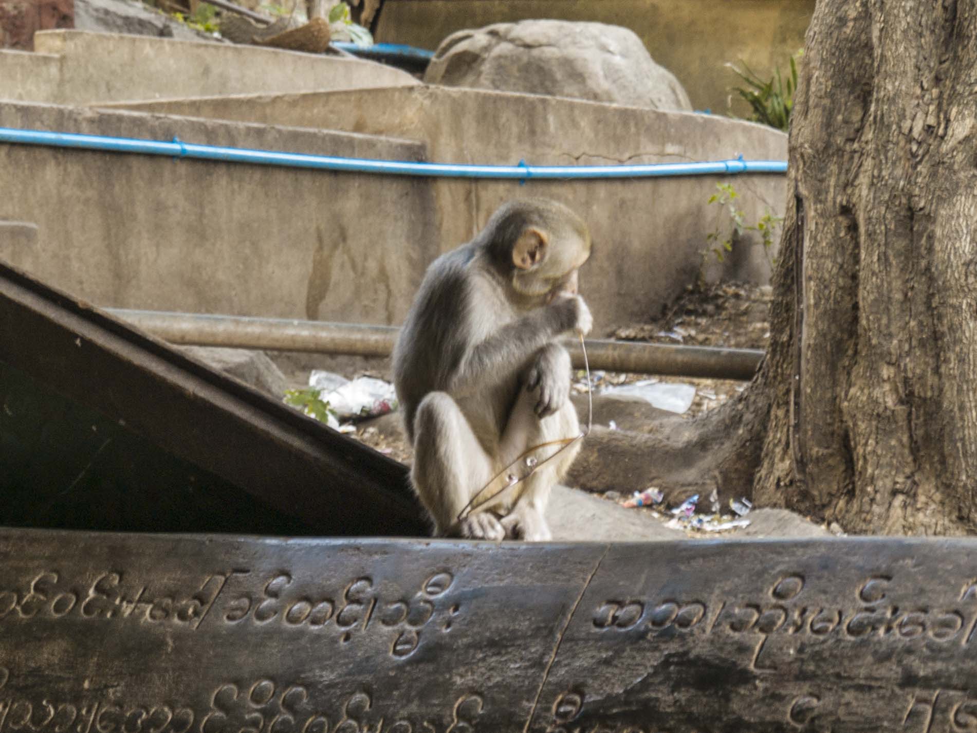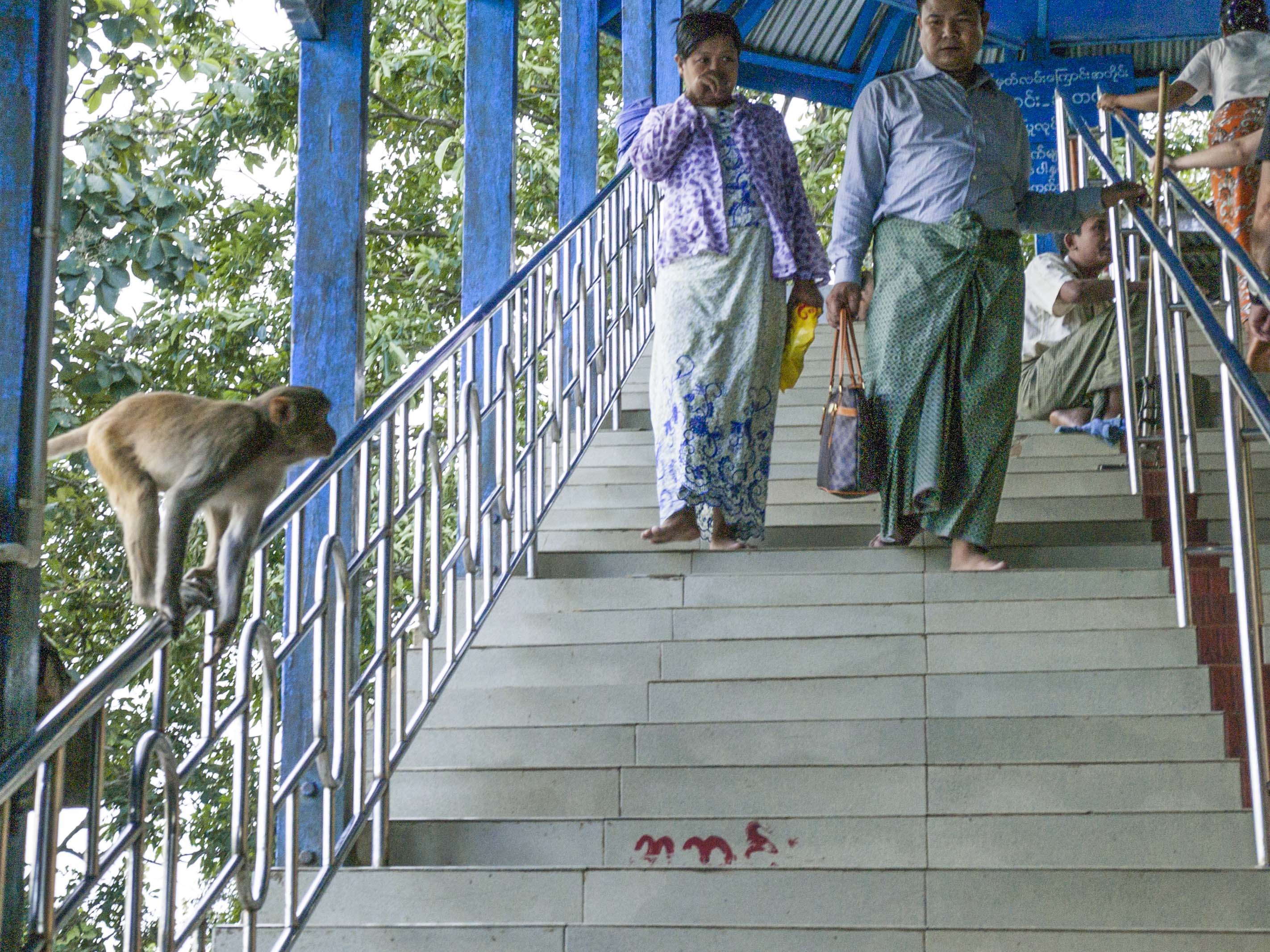Un mono sentado junto a las escaleras lleva, en una de sus manos, las gafas de alguien; hay que poner todo los sentidos tanto en evitar que se acerquen a intentar atrapar cualquier cosa que les apetezca como en no pisar, hay que caminar descalzo, los excrementos que toda la extensa colonia de primates van dejando por la escalera.