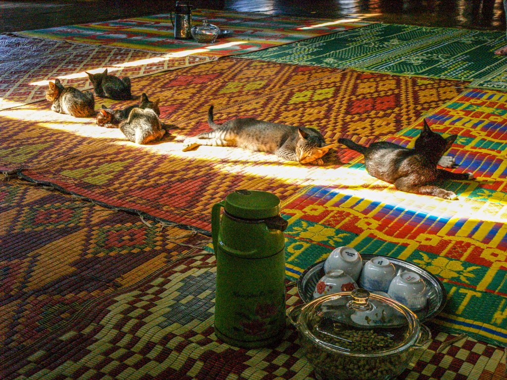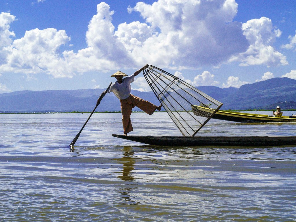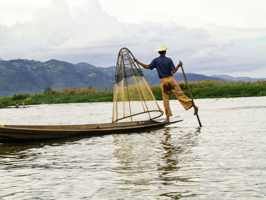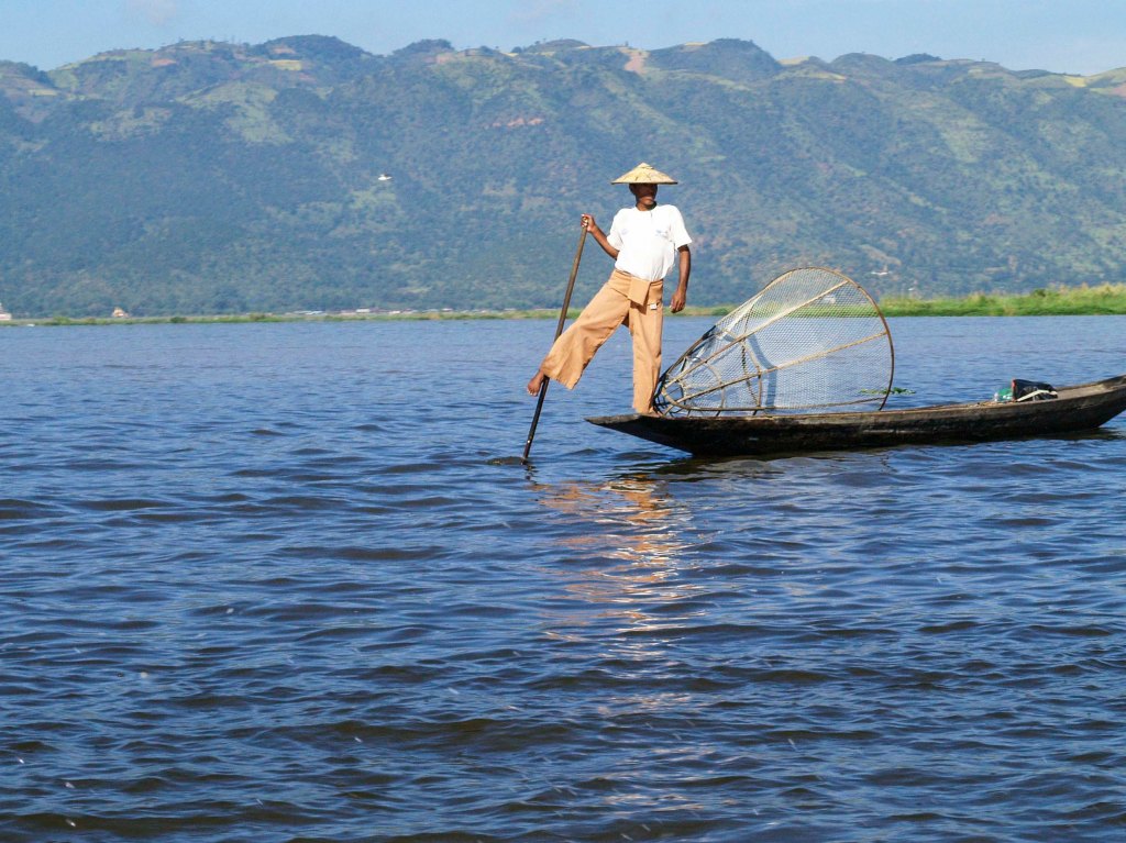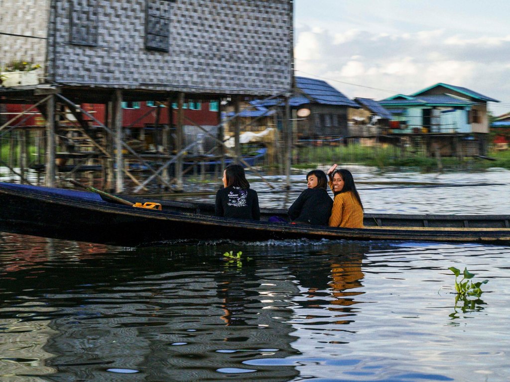 Hace mucho calor, grupos de niños juegan en el agua, entre los palafitos; como una manada de nutrias alegres se comportan como si fuera, realmente lo es, su medio natural. En un templo los gatos toman el sol perezosos, son los dueños del recinto sagrado. Los pescadores siguen remando con una de sus piernas sabiendo que son los únicos artistas de este circo universal que dominan este arte.